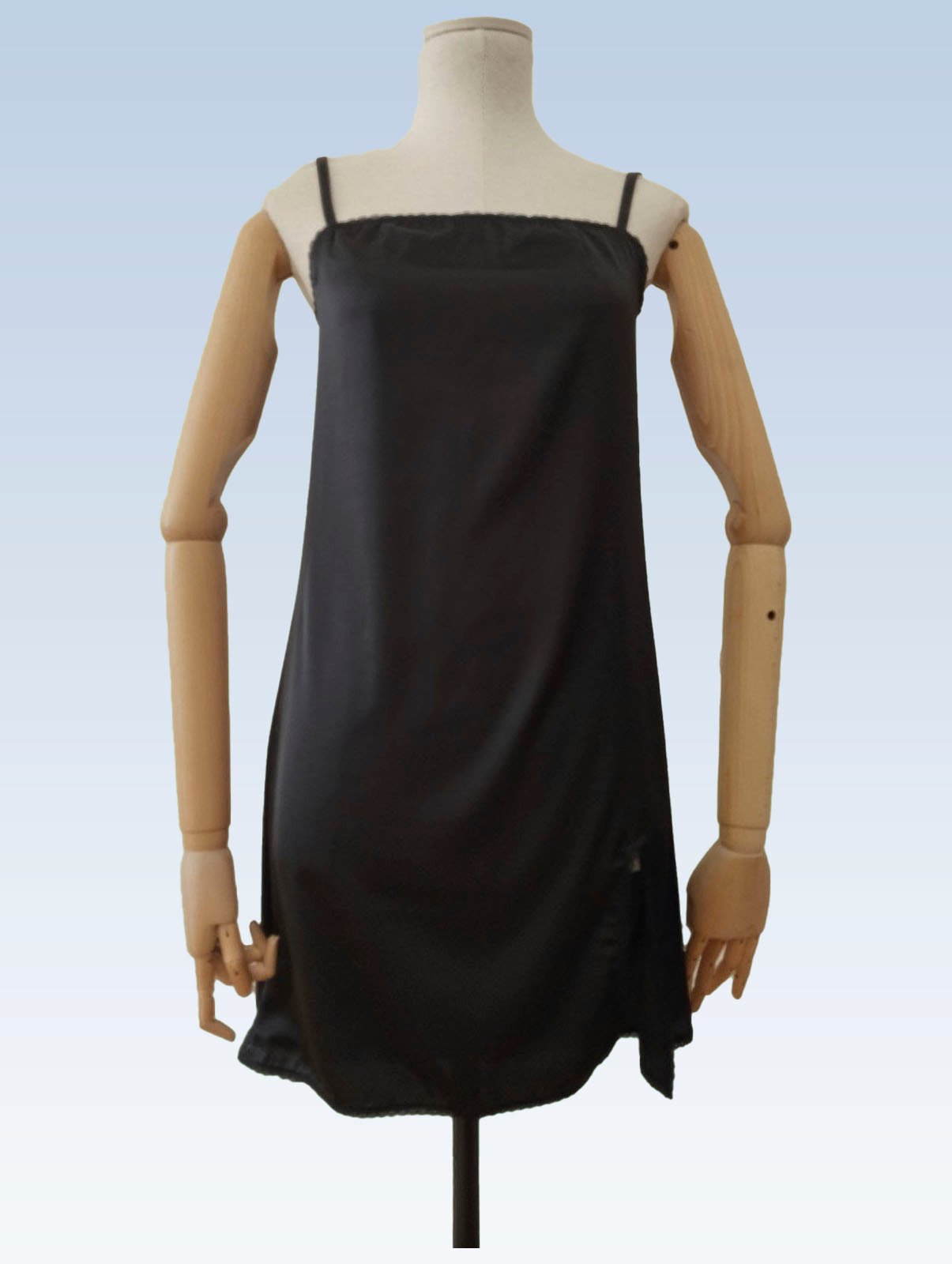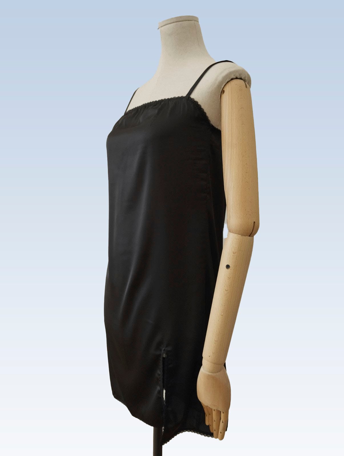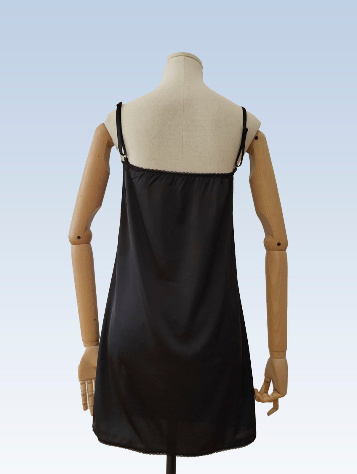 Juodos spalvos prabangūs naktiniai marškiniai iš švelnaus ir neglamžaus „Armani silk“ dirbtinio šilko audinio. Petnešėlių ilgis reguliuojamas, naktinių marškinių priekyje yra dekoratyvus skeltukas, gaminio kraštai su subtiliais smulkučiais nėrinukais. Audinio sudėtis: 98 % poliesteris, 2 % elastanas.