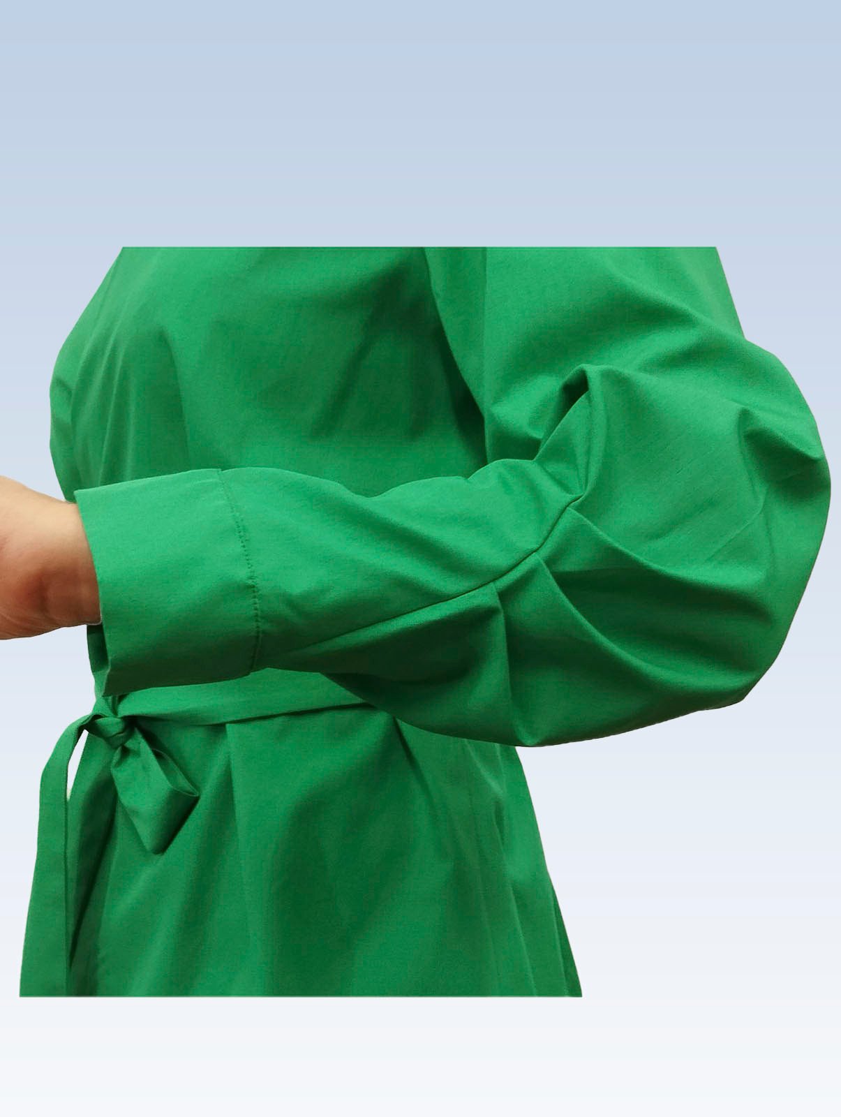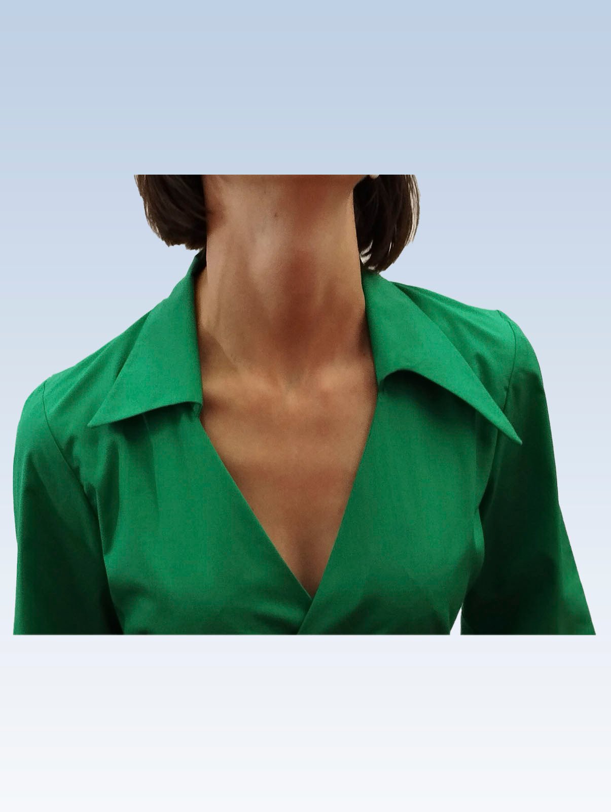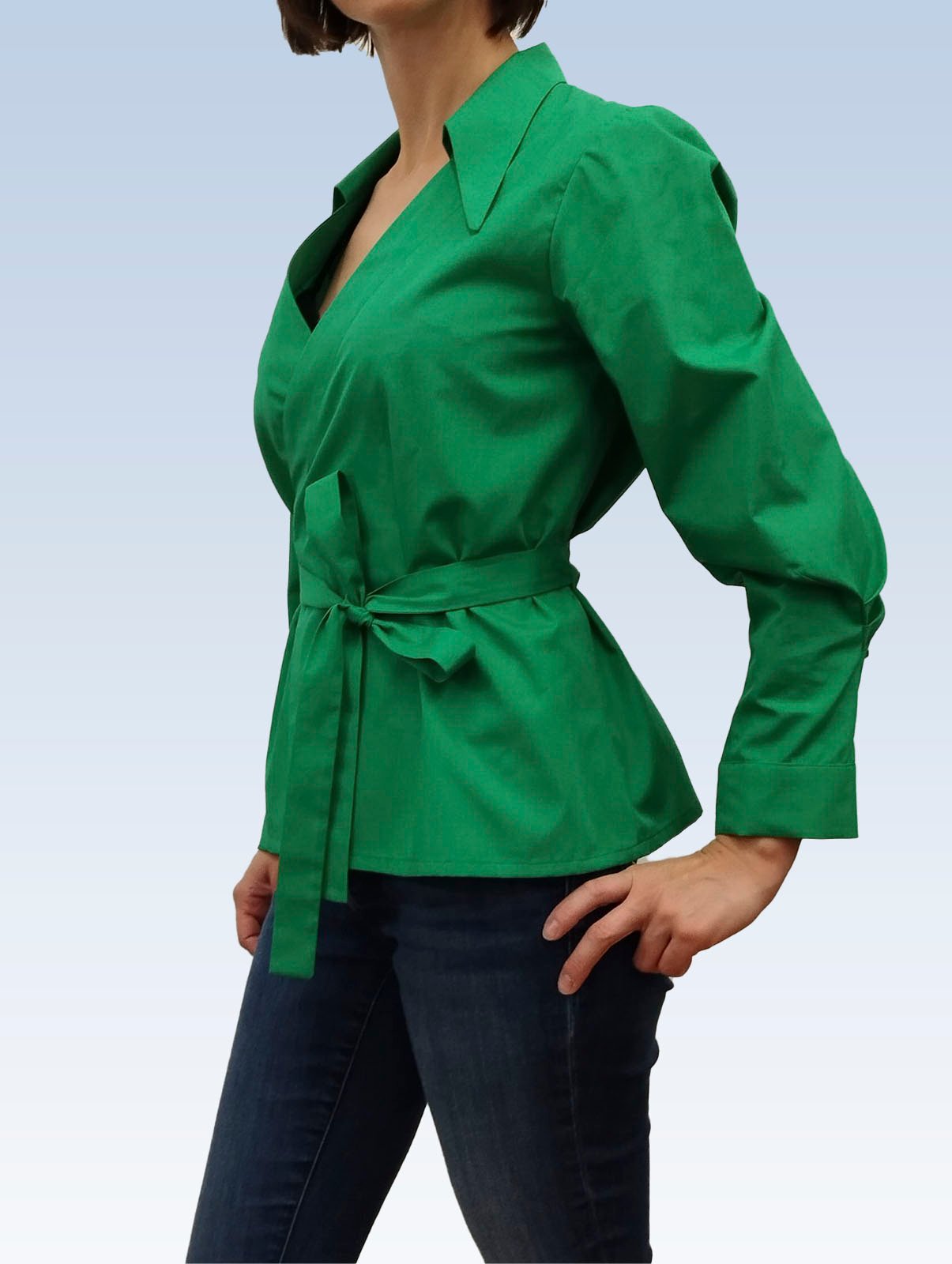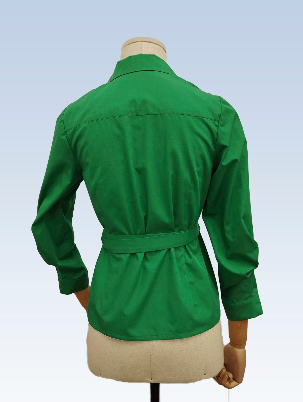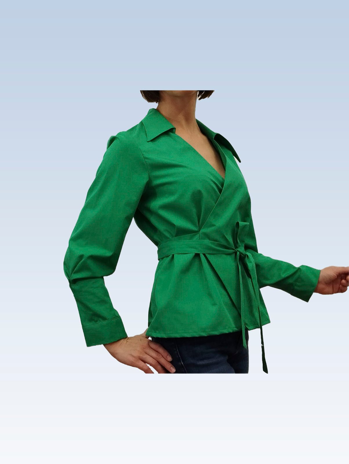 Žalios spalvos susiaučiami ir surišami marškiniai asimetriška apykakle, ilgomis rankovėmis su nedidelėmis klostelėmis. Audinys mažai glamžus.