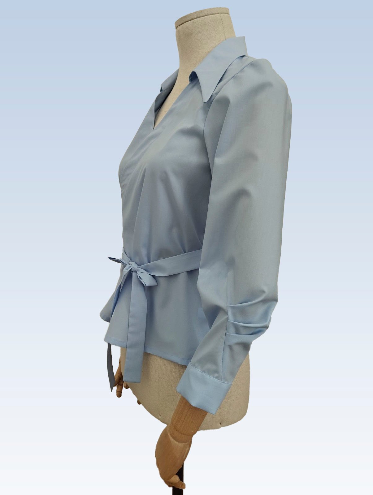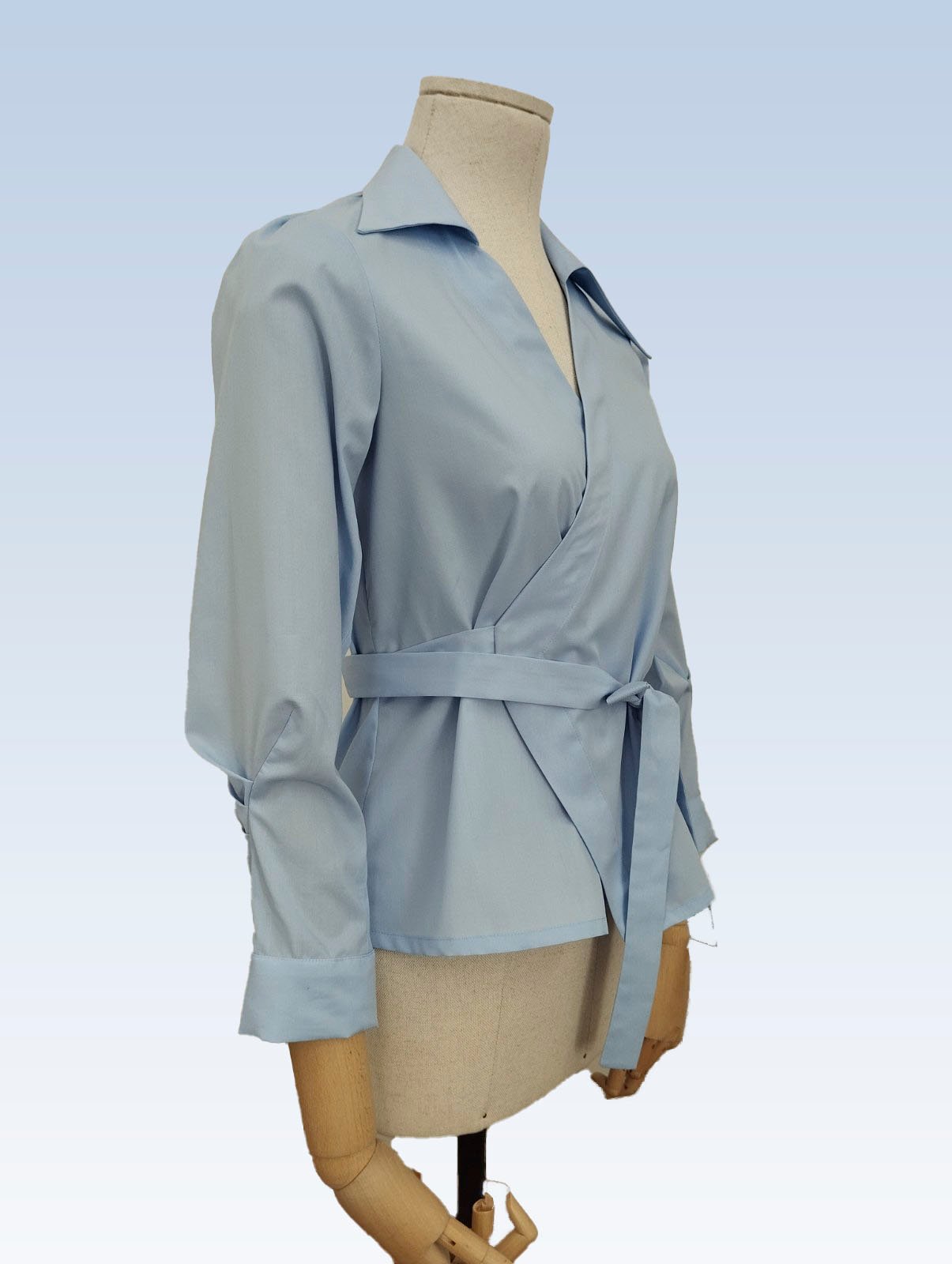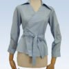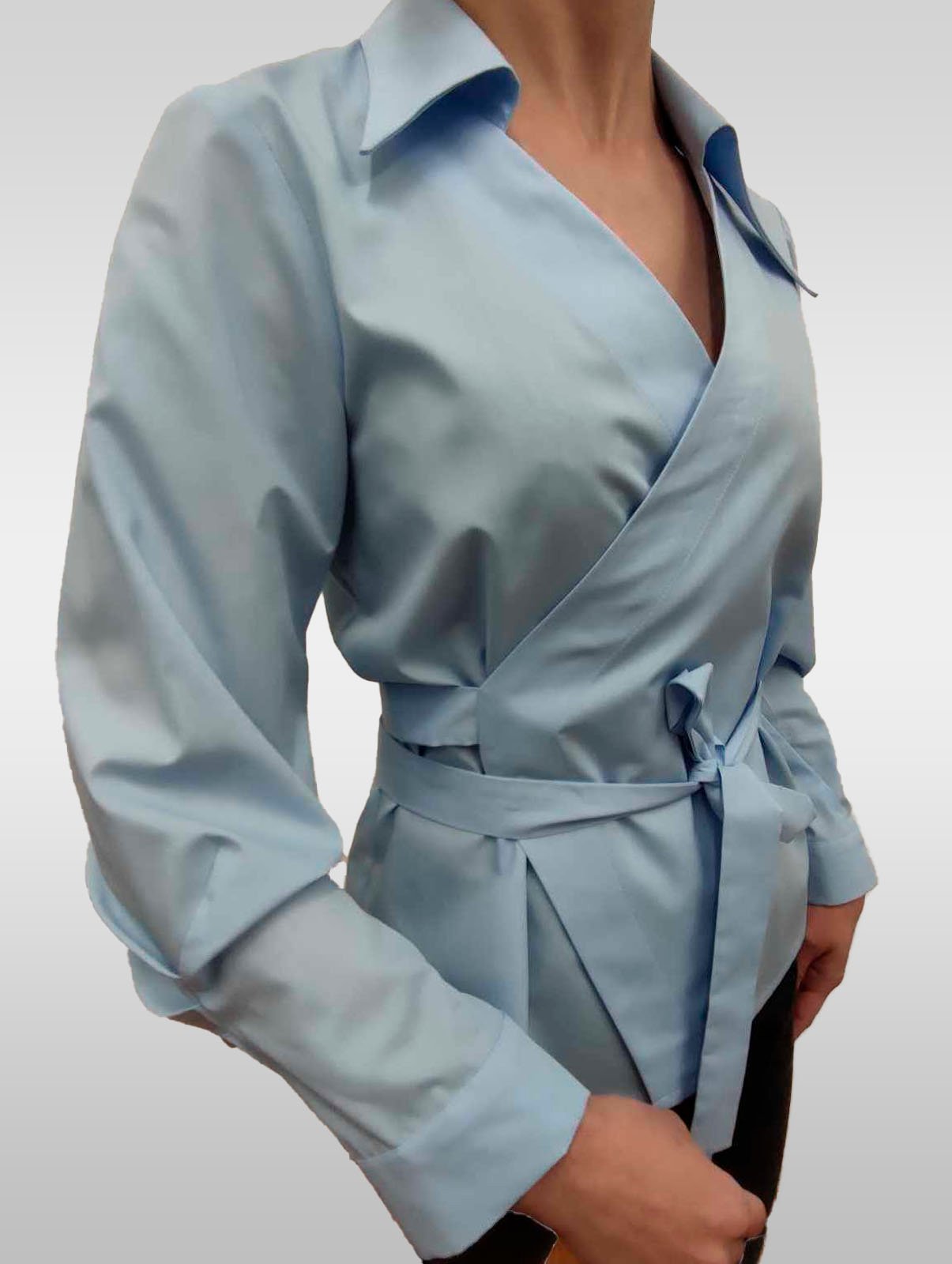 Žydros spalvos susiaučiami ir surišami marškiniai asimetriška apykakle, ilgomis rankovėmis su nedidelėmis klostelėmis. Audinys mažai glamžus.