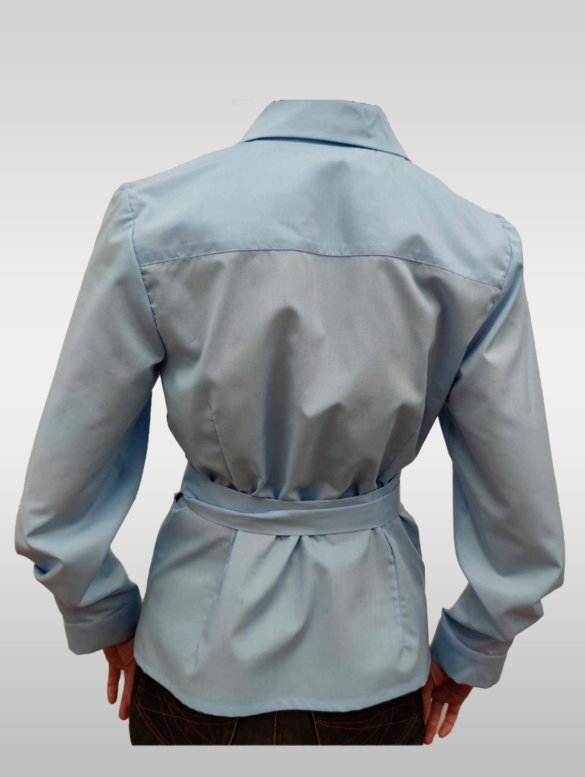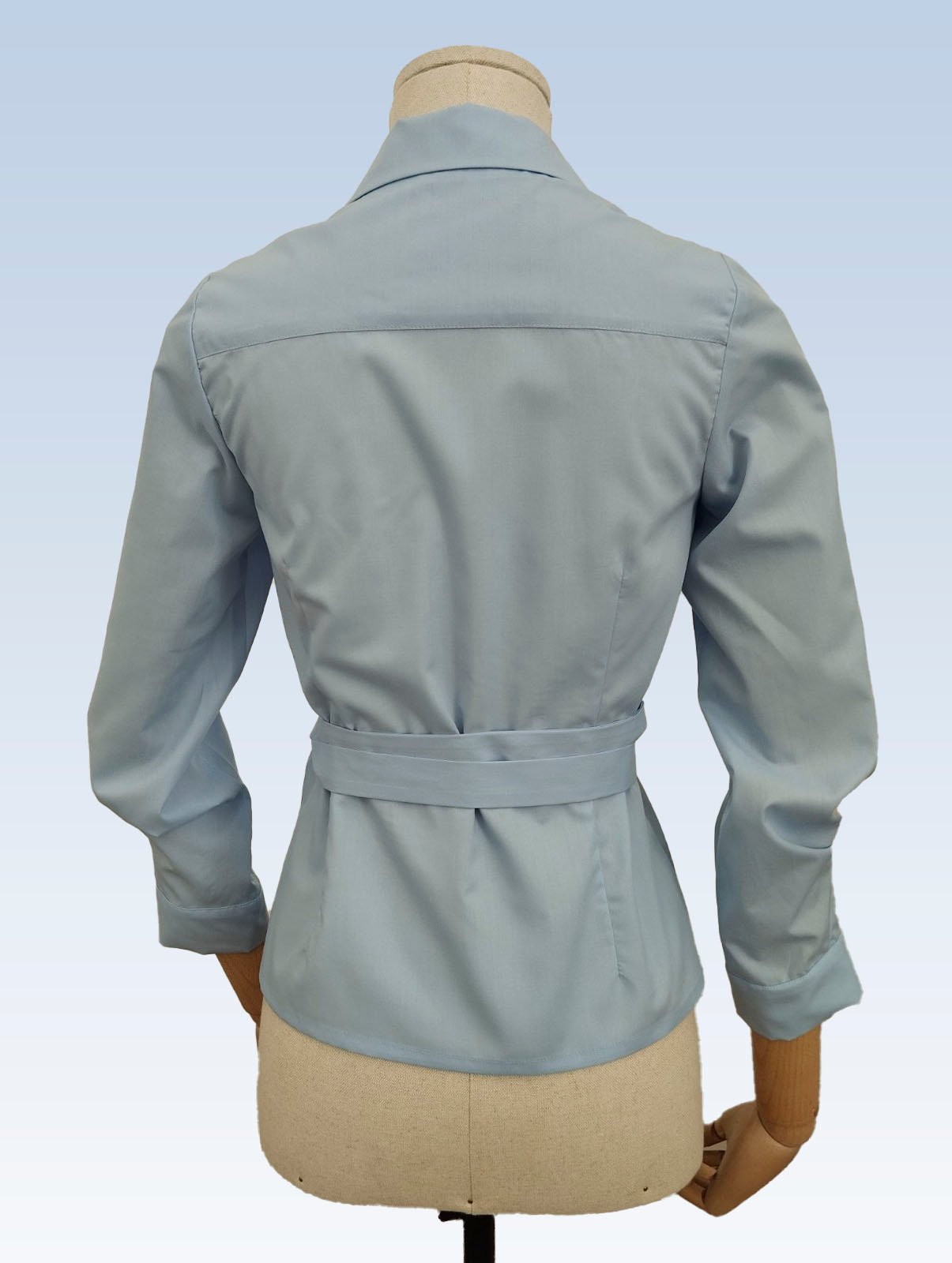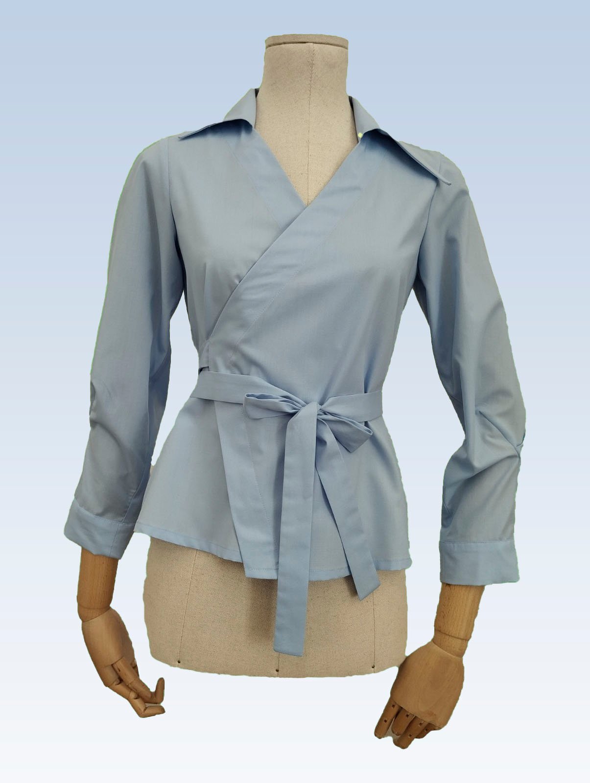 Žydros spalvos susiaučiami ir surišami marškiniai asimetriška apykakle, ilgomis rankovėmis su nedidelėmis klostelėmis. Audinys mažai glamžus.