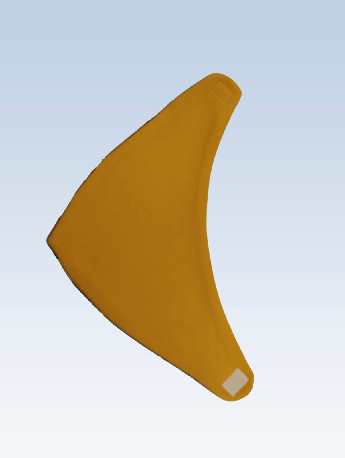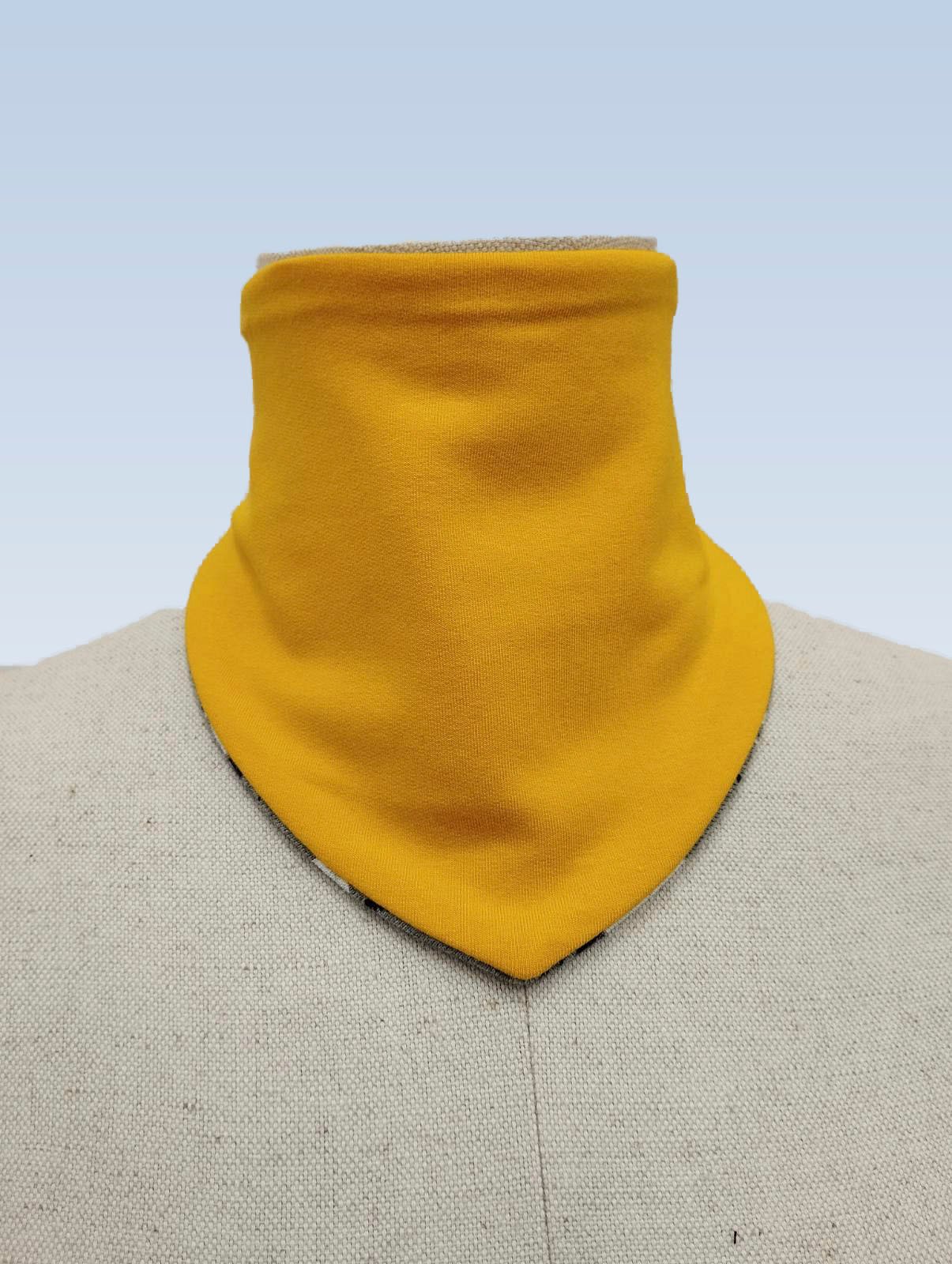 Ryškios geltonos spalvos dvipusė kaklaskarė iš medvilnės trikotažo, užsegama velcro juostele. Kaklaskarę galima dėvėti iš abiejų pusių.